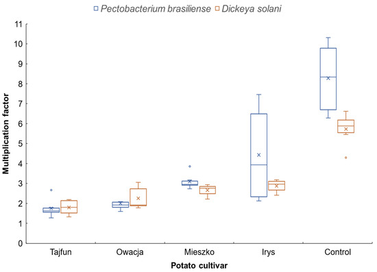 Average multiplication factor (MF) of P. brasiliense and D. solani 24 h after incubation in Luria Berthani medium (control) and Luria Berthani medium with glycoalkaloids isolated from leaves of four potato cultivars; x represents the mean of MF, error bars indicate the minimum and maximum values; the band inside the box represents median from nine replications in each of two independent experiments; the circles represent outliers.