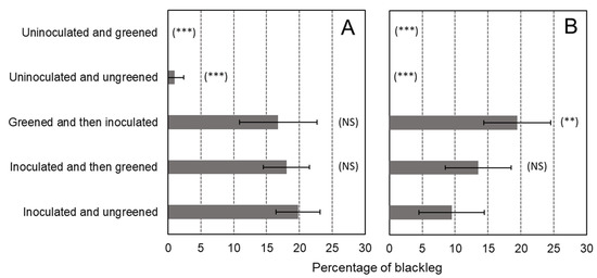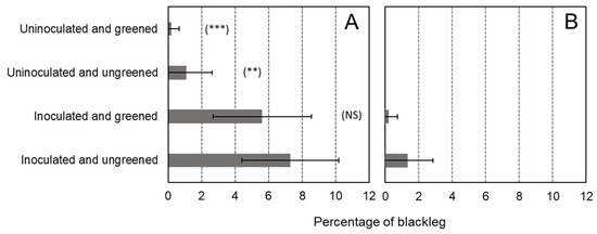 Percentage of blackleg in the trials of 2019 (A) and 2020 (B). The results of the mean comparison Dunnett test are presented in brackets: (NS) for “non-significant”; (**) for p < 0.01; (***) p < 0.001. Each treatment is compared with the inoculated and ungreened treatments. The error bars represent the standard deviations.