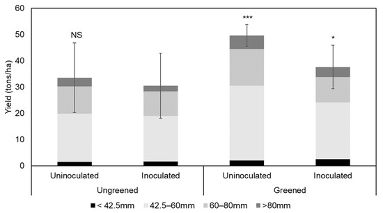 Average potato yield observed cumulatively for the years 2019 and 2020. The results of the mean comparison Dunnett test for the commercial yield (42.5 to 80 mm) are presented in brackets: (NS) for “non-significant”; (*) for p < 0.05; (***) p < 0.001. Each treatment is compared with the inoculated and ungreened treatments. The error bars represent the standard deviations of the commercial yield.