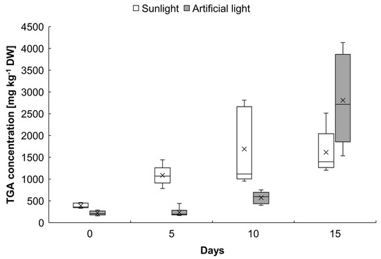 TGA in tubers of cv. Agria significantly increased under both sunlight and artificial light, reaching a plateau on day 10 of exposure to the sunlight and a maximum on day 15 of exposure to artificial light (Figure 6). On day 15, tubers exposed to sunlight had an average of 1613 mg kg−1 DW. of TGA, and those exposed to artificial light had 2806 mg kg−1 DW.