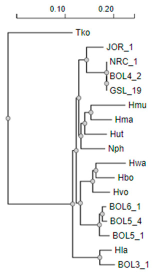- DasSarma, P.; Anton, B.P.; DasSarma, S.; Laye, V.J.; Guzmán, D.; Roberts, R.J.; DasSarma, S. Genome Sequence and Methylation Patterns of Halorubrum sp. Strain BOL3-1, the First Haloarchaeon Isolated and Cultured from Salar de Uyuni, Bolivia. Microbiol. Resour. Announc. 2019, 8, e00386-19. [Google Scholar] [CrossRef]