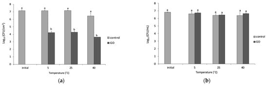 The chemical characterization of the obtained GO was described by Fallatah et al. [11]. Briefly, the GO was shown to have a diameter of >200 nm, a thickness of 1.8 ± 2 nm and a C:O ratio of 2:1 [11]. The effect of temperature on the viability of 48 h biofilms and planktonic cells was monitored by plate counting (CFU/m2) for biofilms and (CFU/mL) for planktonic cells. The controls in biofilms were not significantly affected at low or high temperatures as seen in Figure 1a. In addition, when comparing the biofilms exposed to 85 μg/mL GO for 24 h, different temperatures did not show any effects on the cell viability as shown in Figure 1a. However, when the GO-exposed biofilms were compared to their control counterparts, the growth showed a ~3-log reduction at 5, 25 and 40 °C. In addition, around a 3.5-log reduction in the number of CFUs was observed at 40 °C compared with the initial biofilm and ~3-log reduction was seen in comparison with the control biofilm at the same temperature.