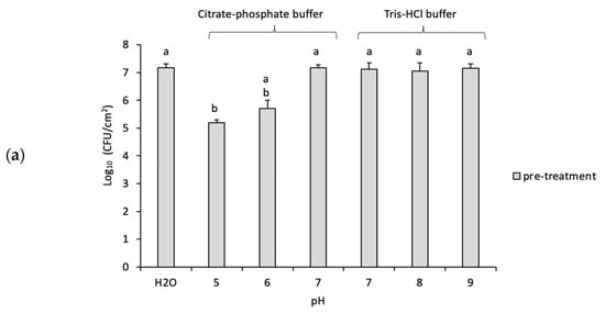 Our study highlights the strong impact of pH on P. putida biofilm and planktonic cells. The pre-treated samples, whether biofilms or planktonic, have been affected by low pH which reduced the viability of cells more than what is seen at higher pHs. Lee et al. studied the effect of pH range (4.0 to 10.0) on the EPS production in P. putida KT2440 using HCl or NaOH [19]. At higher pH, the production of polysaccharide and pellicle formation was enhanced while the latter was reduced in acidic buffers. A similar study found P. putida biofilm production being inhibited at low pH while the amount of EPS increased [6]. Thus, lowering the pH surrounding biofilms using citrate–phosphate buffer might be sufficient to suppress P. putida growth.