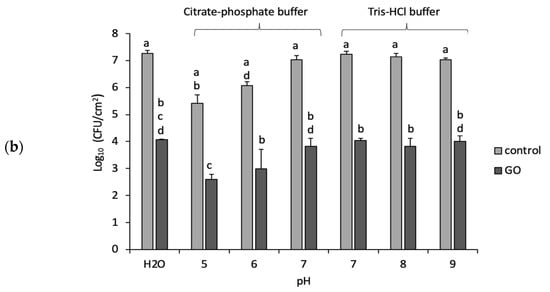 The impact of pH on biofilms is demonstrated in Figure 2a,b which compares the treatment of biofilms with the different pH values, pre- and post-treatment with GO. Herein, we found a direct correlation between the cell viability and pH. For instance, the lower the pH value (5 and 6), the lower the viability of bacterial cells and vice versa until pH 7. The pre-treatment samples showed a slight but not significant reduction in CFU at low pH such as pH 5 (~1.5 log) and pH 6 (~1 log) after incubation for 3 h compared with the initial sample (Figure 2a). However, at neutral or higher pH (pH 7, 8 and 9), there was little or no effect on biofilm cell viability. The post-treatment biofilms incubated with 85 µg/mL GO showed a significant reduction in CFU (~3 log) at all pH ranges. Nevertheless, pH was not found to significantly influence the anti-biofilm activity of GO as shown in Table 3. At pH 5, the differences between pre-treatment and GO were (2.60 ± 0.29) and the differences between pre-treatment and GO were (3.35 ± 0.41) and (3.15 ± 0.35) at pHs 7 and 9, respectively.