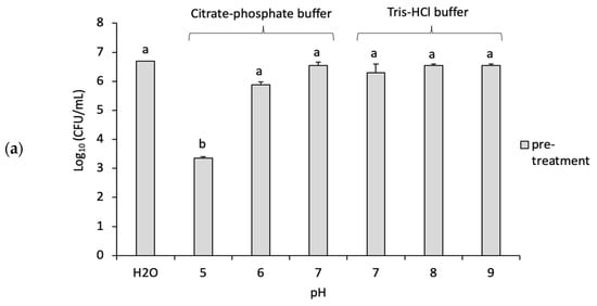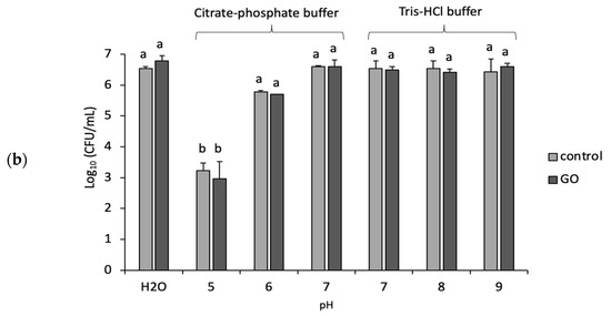 Impact of different pH values on P. putida planktonic cells (a) The viability of the pre-treatment samples of planktonic cells after exposure to different pHs (b) The viability of the control samples (deionized water) or the post-treatment samples (GO at 85 mg/mL) of planktonic cells after the exposure to a constant pH. Mean values with different letters are significantly different (p < 0.05). Similar letters are non-significantly different. The data were analyzed with one-way ANOVA.