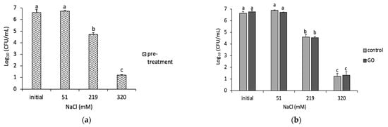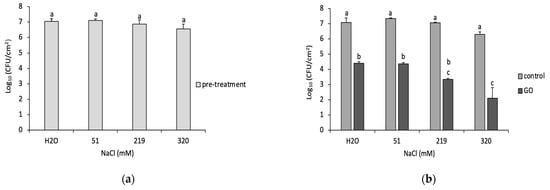 Impact of different osmotic pressure (using NaCl) on P. putida planktonic cells. (a) The viability of planktonic cells after exposure to various concentrations of NaCl (pre-treatment). (b) The viability of planktonic cells following 24 h exposure to constant NaCl concentrations (51, 219 and 320 mM) and incubation with deionized water (control) or 85 mg/mL GO. Mean values with different letters are significantly different (p < 0.05). Similar letters are non-significantly different. The data were analyzed with one-way ANOVA.