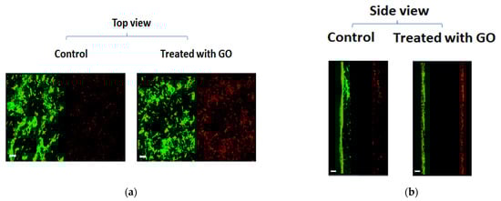 Confocal images of P. putida biofilm with or without GO (85 µg/mL) following 48 h incubation with 320 mM NaCl. The biofilms were stained with SYTO 9 (left, green) and PI (right, red). (a) Top view (b) side view. Scale bar: 20 µm.
