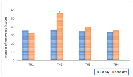 Honeybee colonies’ strength variations between control (TH1, TH4) and experimental groups (TH2, TH3) by the estimation days (1st and 42nd day from the initial day of the experiment); statistically significant difference for TH2 on the second day of estimation vs. TH1, TH3, and TH4; * p < 0.05.