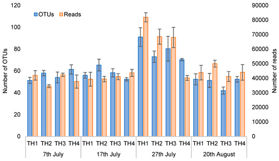 Comparison of the number of OTUs and readings on each treatment and sampling date. Each column in the graph shows the average (n = 3) of the number of OTUs and readings on each treatment and sampling date. Values represent mean ± SEM.