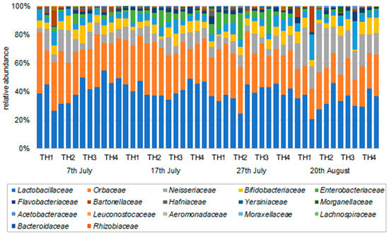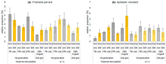 The relative proportion of Frischella perrara tended to be higher in TH1 inoculated with Nosema spp. spores than in TH4. The proportion of F. perrara increased until 27th July in treatments not inoculated with Nosema spp. spores (TH4 and TH2). In the treatments (TH1 and TH3) inoculated with Nosema spp. spores, the proportion tended to be lower in TH3 with EM® for bees (Figure 10a). Apibacter mensalis in the treatments with inoculation with Nosema spp. spores (TH1 and TH3) increased in proportion until 27th July. In contrast, the treatments without inoculation (TH2 and TH4) tended to be stable (Figure 10b).