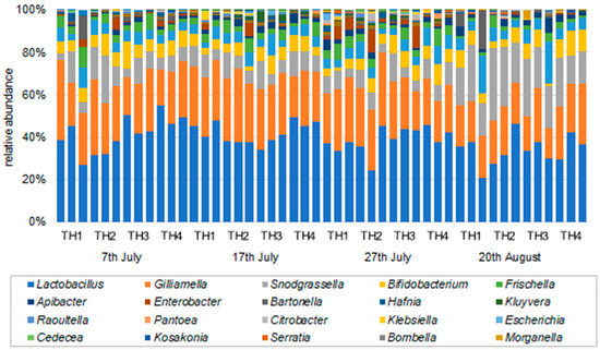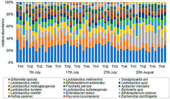 The number of OTUs and readings at the species level for each sampling date and treatment obtained from the amplicon sequence are shown in Figure 2. The number of OTUs and readings on 27th July increased in TH1, TH2, and TH3. However, the number of readings did not increase in TH4. The lifespan of adult summer honeybees is about 42 days, suggesting that most of the July 27th bees were old, and most of the August 20th bees were bees of the next generation.