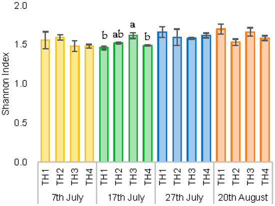 Diversity index (Shannon index) using family data: comparison of treatment intervals and collection dates. There is a significant difference between the days of collection. Values represent mean ± SEM (n = 3). Letters above bars indicate treatments that differ significantly (Tukey HSD test, α = 0.05).