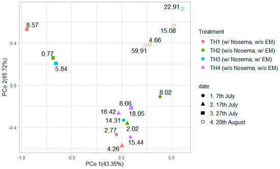 The results of a principal coordinate analysis (PCoA) visualizing the similarity of complex data (e.g., plotted figures) are shown in Figure 7. The labels of each plot mean the number of Nosema spp. spores in the gut of bees. PCoA examined at the species level showed that the plots of the 20th of August samples were away from the other sampling date, further the 27th of July treatments, except for TH4, which was also plotted apart from the other plots. The samples taken on 7th July and 17th July were plotted close together, while TH2 with EM was located slightly further away. In the samples from 27th July, only TH4 was plotted close to the aforementioned samples, while TH2 and TH3 (with EM® for bees treatment) were plotted far from them. This cluster is a relatively low spore count group for Nosema spp.
