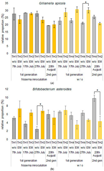 The effects of Nosema spp. spore inoculation and EM® for bees supplement application on the relative proportions of the major species are represented in Figure 8. Gilliamella apicola, which accounted for the highest proportion in all treatments, increased the proportion of the intestinal microbiome by inoculation with Nosema spores (TH1). On the other hand, of the treatments that were not inoculated with Nosema spores, TH4, where spores increased in the gut after infection with Nosema, had the lowest proportion of G. apicola until 27th July, while TH2 with EM application had the highest relative proportion of G. apicola and moreover kept the lowest number of Nosema spores in the gut (a). The relative proportion of Bifidobacterium asteroides in TH1 inoculated with Nosema spp. spores was lower than in TH4 without Nosema inoculation, and the proportion continued to decline until 27th July. Even with inoculation with Nosema spores, the relative proportion of B. asteroides was not low in TH3 with EM application and remained high until 27th July (b).