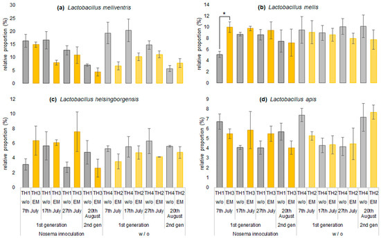 Effect of implemented treatments on the relative proportions of major species: (a) Lactobacillus melliventris, (b) L. mellis, (c) L. heisingborgensis, and (d) L. apis. Values represent mean ± SEM (n = 3). Statistical analysis was conducted using Student’s t-test; * p < 0.05; w/o—without, w—with.