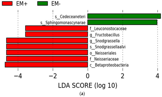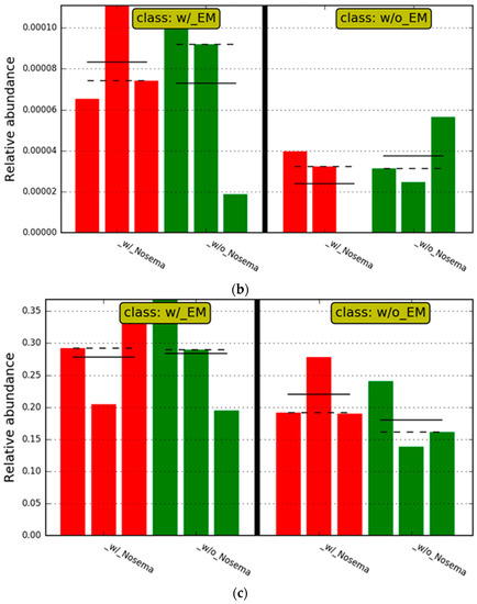 The relative abundances of characteristic microorganisms that showed significant differences in the EM® for bees treatment are shown in Figure 11b,c. The relative abundance of Fructobacillus and Snodgrassella alvi was significantly increased by supplemental treatment, regardless of the group with and without Nosema spp. infection.
