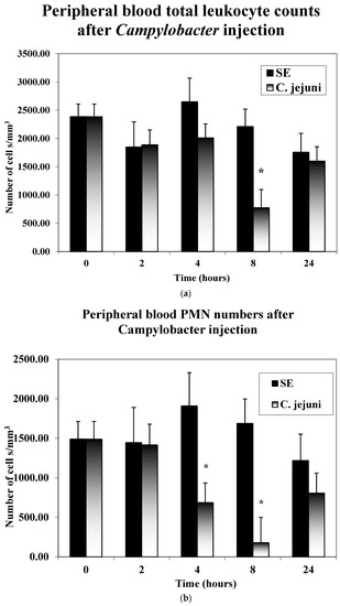 As seen in Figure 1a,b, the number of leukocytes in the peripheral blood decreased significantly at 8 h post-injection in the CJ-injected birds. In particular, the number of heterophils in the peripheral blood were observed to decrease at 4 h post-injection, which continued at 8 h post-injection, then increased at 24 h post-injection. Salmonella-injected birds showed a marked increase in peripheral blood heterophils at 4 and 8 h post-injection, then decreasing at 24 h post-injection.