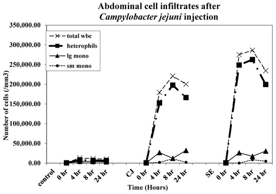 In theory, the decrease in heterophils in the CJ-injected group in the peripheral blood would be expected due to an influx of heterophils in the abdominal cavity. However, this trend is not seen in Salmonella-injected birds. Both in the peripheral blood and abdominal cavity, large increases in heterophils are observed in Salmonella-injected birds. The total leukocyte counts in the abdomen and peripheral blood are higher in the Salmonella-injected group. The results would appear to point to a much more robust immune response of the host to Salmonella injection compared to CJ injection. The current literature on Campylobacter and the immune response of chickens appear to support this observation [9,10,11].