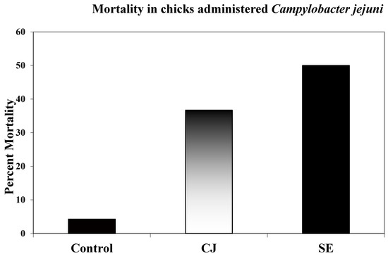 Chicks were injected intra-abdominally with 1 × 108 CFUs CJ; 1 × 108 SE and mortalities were recorded for 72 h post-injection. Total number of chickens used in three repetitions in mortality studies: control 220; CJ 205; SE 200. Birds that succumbed in the first 4 h post-infection were not considered CJ- or SE-associated mortalities. Birds whose condition provoked humane euthanasia were considered mortalities for all groups after the first 4 h post-infection.