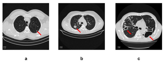 An example of computed tomogram images of active lung TB. (a) Lung tuberculoma without “decay”. In S2 of the left lung, there is a rounded formation with clear contours 5 mm in diameter (red arrow); (b) Lung tuberculoma with “decay”. In S2 of the right lung, there is a rounded formation 2 cm in diameter with a small decay cavity in the center (red arrow). In the surrounding tissue, single foci and fibrous changes; (c) FCT. In the right lung in S2, there is a decay cavity with irregular contours and infiltration around the walls (red arrow). The decay cavity is drained S2. In the rest of the upper lobe, calcifications and foci with infiltration and decay. On the left, there is a large decay cavity in S6 with uneven contours (red arrow). Limited empyema of the pleura on the left in the S6 projection cannot be ruled out.