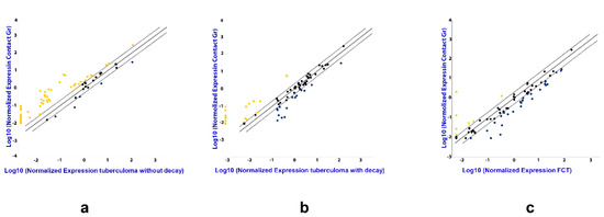 The difference in the expression of genes encoding mature miRNAs in the serum of active lung TB patients. Gene expression values as fold-change for lung tuberculoma without “decay” versus healthy control (a), lung tuberculoma with “decay” versus healthy control (b) and FCT versus healthy control (c). The median value for each gene from three independent replicates per group is presented in log10 scale. Yellow point—upregulated miRNAs as compared with control group; Black point—unchanged miRNAs as compared with control group; Blue point—downregulated miRNAs as compared with control group; Dotted line—the boundaries of the area in which the values are less than 2 times different from the control group; Solid straight line—values are identical to the control group.