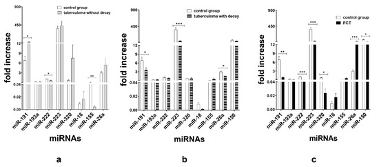 Expression of genes encoding mature miRNAs in the serum of active lung TB patients and control group. Lung tuberculoma without “decay” as compared with healthy control (a), lung tuberculoma with “decay” as compared with healthy control (b) and FCT as compared with healthy control (c). Mean ± SD are shown (n = 50 patients per each group). *—p < 0.05; **—p < 0.01; ***—p < 0.001.