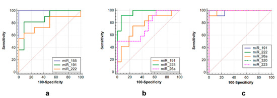 Three sets of miRNAs were selected to efficiently discriminate between three groups of post primary TB patients. The first one consisted of miR-155 (AUC = 0.948, sensitivity = 90.9%, specificity = 92.9%), miR-223 (AUC = 0.939, sensitivity = 98.2%, specificity = 93.3%) and miR-191 (AUC = 0.948, sensitivity = 86.7%, specificity = 92.9%) to differentiate tuberculoma without “decay” from tuberculoma with “decay” (Figure 6a). The second was comprised of miR-191 (AUC = 0.944, sensitivity = 86.7%, specificity = 85.7%), miR-222 (AUC = 0.938, sensitivity = 93.3%, specificity = 92.3%), miR-320 (AUC = 0.965, sensitivity = 93.3%, specificity = 92.3%), miR-26a (AUC = 1.0, sensitivity = 100%, specificity = 100%) and miR-150 (AUC = 0.931, sensitivity = 93.3%, specificity = 71.4%) to discriminate tuberculoma with “decay” and FCT (Figure 6b). The third one included miR-191 (AUC = 1.0, sensitivity = 100%, specificity = 100%), miR-222 (AUC = 1.0, sensitivity = 93.3%, specificity = 93.3%), miR-223 (AUC = 0.939, sensitivity = 100%, specificity = 93.3%), miR-155 (AUC = 0.977, sensitivity = 100%, specificity = 90.9%) and miR-26a (AUC = 0.932, sensitivity = 100%, specificity = 75%) to discriminate between tuberculoma without “decay” and FCT (Figure 6c).