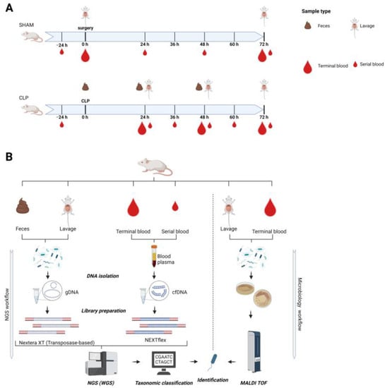 Schematic illustration of the study design (A) and of the analytical workflow (B). (A): Three-month-old female mice (n = 45) were subjected to polymicrobial cecal ligation and puncture (CLP) sepsis (lower axis) or served as sham controls (upper axis) and were sampled in defined intervals for blood, feces, and abdominal lavage until 72 h post-CLP. Small blood drop indicates a serial small-volume sampling; large blood drop indicates terminal blood sampling. Short-interval serial blood sampling was performed maximally three times per individual mouse (i.e., serial blood sampling time points varied among mice to cover intervals smaller than 24 h) followed by terminal large-volume sampling. In each mouse, feces were collected at CLP and at the sacrifice time point. In each mouse, abdominal lavage was performed at the sacrifice time point. Body weight and temperature were taken daily. (B): NGS workflow was performed for all sample types. DNA was isolated, and all libraries were used for whole genome shotgun sequencing; nonmurine reads were classified and used for identification of species. Abdominal lavage and terminal blood were used for microbiological culturing in parallel. Growing cultures were used for species identification by means of MALDI TOF.