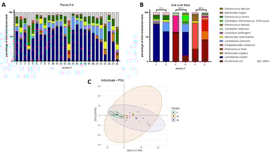 Healthy and post-CLP gut microbiome. (A): Healthy gut microbiome (0 h), percentage share of total normalized sequencing reads of top species shown for different mice. (B): Septic gut microbiome at 0 h, 24 h, and 48 h post-CLP, percentage share of total normalized sequencing reads of top species shown for different mice. (C): PCA of microbiomes at 0 h, 24 h, and 48 h post-CLP. Time points are indicated by color and shape of the symbols; bold symbols are centroids of the corresponding group.