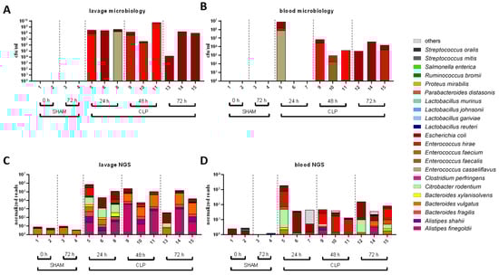 Next, we analyzed microbial colonization of the peritoneum and blood by (i) whole genome shotgun sequencing and (ii) classical microbiological culture to characterize the transition of species from the gut to systemic circulation (Figure 3). In sham mice, no pathogens were detected by culture-based methods in the peritoneal lavage and blood, while NGS identified only minor species with lowest read numbers indicative of microbial contaminants. However, pathogens in CLP mice including Enterococcus casseliflavus, E. hirae, E. coli, and E. faecalis were already found as dominant species in the blood and lavage samples by microbiological culture after 24 h (Figure 3A,B). Notably, pathogenic species colonization could differ significantly between mice and compartments, whereby NGS analysis typically revealed the same pathogens as classical culture-based microbial diagnostics (Figure 3C,D). However, additional species, including B. fragilis, B. vulgatus, Citrobacter rodentium, and C. perfringens, were exclusively identified by metagenomics sequencing. Sporadically, NGS analyses also detected species with lowest abundance (<10 normalized reads) in lavage and blood of sham mice, but those were considered to be background noise derived from contamination.