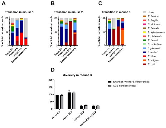 Transitions of species from the feces to bloodstream/peritoneum at 24 h post-CLP in three mice. (A–C): Percentage of the most abundant species in feces at 0 h and 24 h, lavage at 24 h, and terminal blood sample at 24 h after CLP. (D): Community diversity and richness shown for all sample types of mouse 3 indicated by Shannon–Wiener diversity index and ACE richness index. Standard errors are shown.