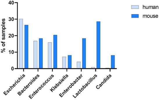 The blood pathogen identification from our CLP experiments was also retrospectively juxtaposed to readouts obtained from human patients suffering from abdominal sepsis (Figure 6; Supplementary Figure S4). A qualitative comparison reveals a high interspecies similarity, given that the most prominent microbial genera detected in septic patients were also identified in CLP mice. This significant overlap of genera indicates a good correlation between human and murine pathobiome characteristics in abdominal sepsis. However, our comparison also indicated some differences in the relative occurrence of species. While Escherichia, Bacteroides, Enterococcus, and Klebsiella species demonstrated a similar occurrence, Enterobacter, Lactobacillus, and Candida species were more frequently detected in the murine sepsis blood samples.