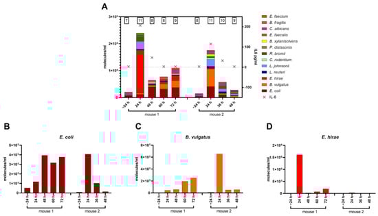 (A): Concentration for top species shown in molecules/mL of serial blood samples for two mice at different time points. The numbers above bars indicate the number of detected top species. Crosses indicate a corresponding IL-6 concentration in the blood per time point. (B–D): Time course of the most abundant species in molecules/mL of serial blood samples in two individuals.