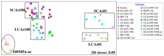 The nMDS analysis was performed to evaluate the similarities of microbial communities according to different pressures, oxygen levels, and n-alkane components. A total of five clusters were formed: the SCA01, LCAs01, SCAs100, LCAs100, and 100 MPa-ae clusters (Figure 1).