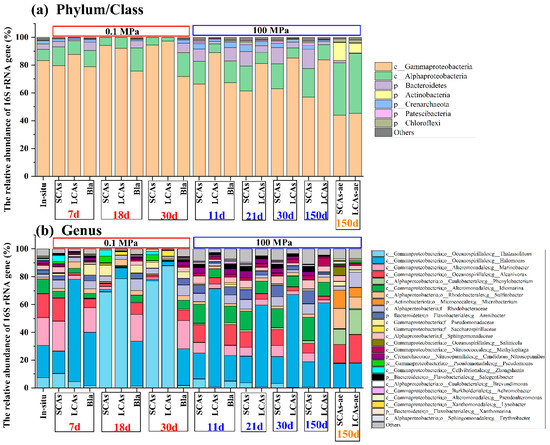 For example, at 0.1 MPa, Gammaproteobacteria tended to increase with incubation time, with the average relative abundance changing from 79.7% (or 87.7%) at 7 d to 94.4% (or 97.2%) at 30 d in anaerobic SCAs (or LCAs) treatments. However, Alphaproteobacteria seemed to decrease with incubation time, with the average relative abundance varying from 13.3% (or 9.7%) at 7 d to 5.5% (or 2.6%) at 30 d in anaerobic SCA (or LCA) treatments. In addition, Bacteroidetes appeared to decrease dramatically in both SCAs and LCAs treatments, with 0.1% of the average relative abundance (Figure 2a).