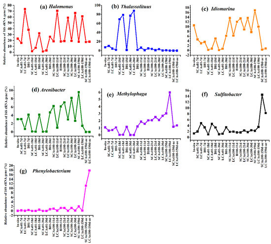 However, at 100 MPa, the dominant microbial genera for anaerobic SCA enrichments rapidly changed into Idiomarina and Arenibacter, with the relative abundance increasing from 13.6% and 6.2% at 11 d to 16.9% and 9.6% at 150 d (Figure 2b and Figure 3). Differently, the microbial communities for anaerobic LCAs100 enrichments were predominated by Halomonas (changed from 70.6% at 11 d to 61.2% at 150 d), Idiomarina (6.2–10.0%), and Methylophaga (1.6–6.0%).