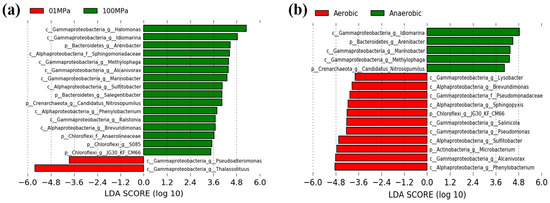 The linear discriminant analysis (LDA) identified the significantly different indicators between different pressure or oxygen treatments, with LDA scores of 5.0. (a) 0.1 MPa vs. 100 MPa; (b) aerobic vs. anaerobic.