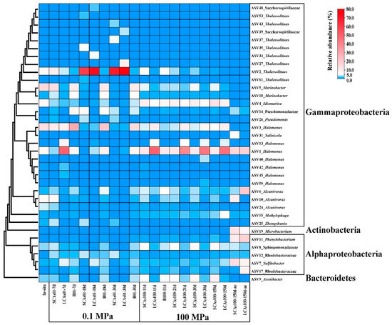 Our results showed that a total of 2 and 16 indicative phylotypes were detected when comparing 0.1 MPa and 100 MPa, respectively (Figure 4a). For instance, two key genera, Thalassolituus (Gammaproteobacteria) and Pseudoalteromonas (Gammaproteobacteria), were responsible for the community differences at 0.1 MPa, whereas 16 dominant taxa, such as Halomonas (Gammaproteobacteria), Idiomarina (Gammaproteobacteria), Arenibacter (Bacteroidetes), and Sphingomonadaceae (Alphaproteobacteria) took charge of the community discrepancy at 100 MPa.