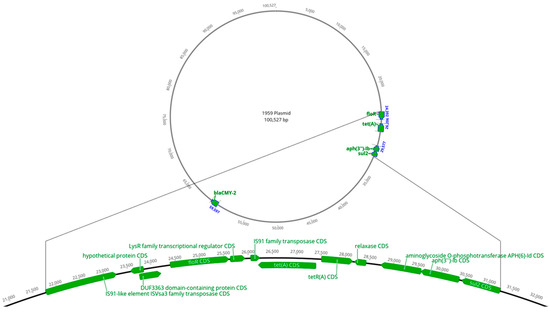By WGS, all 41 isolates (100%) had the following AMR genes on the chromosome: aac(6′), aac(6′)-Iaa, and aadA (all involved in aminoglycoside resistance); ampH (a penicillin-binding protein; PBP); bacA (involved in bacitracin resistance); and mrdA (a PBP known to confer reduced susceptibility to carbapenems) (Table S6). However, the presence of these genes was not associated with AMR for the respective antibiotic classes. Instead, resistance was associated with the following: aminoglycoside with aph(3″)-Ib and aph(6)-Id; phenicol with floR; tetracycline with tet(A); sulfonamide with sul2; and β-lactam with blaCMY-2 (Table S6). A total of 25 out of 41 isolates were positive for all 5 genes: floR, tet(A), aph(6)-Id, aph(3″)-Ib, and sul2 (Table 3), typically arranged in that order and flanked by ISVsa3 (Figure 1 and Figure 2). Hence, an MDR phenotype was predominantly associated with carriage of ISVsa3 in which the genes were most often located on an IncC type plasmid that also carried blaCMY-2 (Table 4; Figure 1). Based on the combined results of endpoint PCR and WGS, 31/33 (93.9%) MDR isolates were positive for ISVsa3, whereas 6/78 non-MDR isolates (7.7%) were positive for ISVsa3 (OR = 186.00, p < 0.0001; Table 5). In addition, based on combined data from endpoint PCR and WGS, of the 111 isolates, the number (percentage) positive for the above-mentioned genes was: 38 (34.2%) for ISVsa3; 27 (24.3%) for blaCMY-2; 33 (29.7%) for floR; 30 (27.0%) for tet(A); 38 (34.2%) for sul2; and 31 (27.9%) for both aph(3″)-Ib and aph(6)-Id (Tables S6 and S7). The serotypes in which ISVsa3 was found included S. Derby, S. Uganda, S. Typhimurium, S. Newport, S. Dublin, S. Muenster, S. Heidelberg, and S. Saintpaul (Table S6).