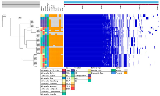 Maximum-likelihood phylogenetic tree constructed from an alignment of core genes and selected metadata. The right panel shows a broad overview of the presence/absence of all genes sequenced for each strain. The phylogeny depicts the evolutionary relationship of the isolates sequenced. Ten serovars were represented in the metadata of the 41 S. enterica isolates subjected to WGS. These diagnostic cases and feedlot pen strains were isolated in eight different years spanning a ten-year period from different areas in the US. The presence and absence of ISVSa3 and pertinent genes can be visualized in orange and grey, respectively (presence of ISVsa3, 36/41; aph(3″)-Ib, 30/41; aph(6)-Id, 29/41; floR, 30/41; tetA, 27/41; sul2, 36/41; cmy2, 25/41). The core gene alignment to the right (in dark blue) reflects the conservation and diversion in these genomes.