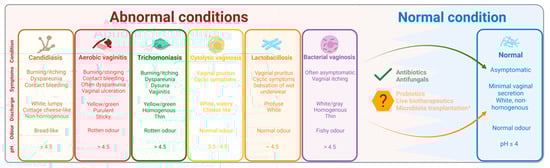 The normal and most common abnormal microbial conditions of the vagina. Created with BioRender.com. Schematic figure showing the characteristics of the most common abnormal microbial conditions of the vagina. Proper diagnosis and treatment can lead to a normal condition. However, recurrent infection and treatment resistance/failure is more and more common, paving the way for new treatment modalities such as probiotics, live biotherapeutics and microbiota transplantation.