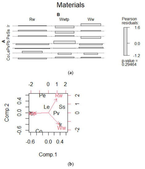 (a) Material–type of water, Pearson’s residuals; (b) Material–type of water, biplot. Recycled water (Rw), wastewater treatment plant water (Wwtp), well water (Ww). Copper (Co), lead (Le), iron (Ir), stainless steel (Ss), polybutylene (Pb), polyethylene (Pe), polyvinyl chloride (Pv).
