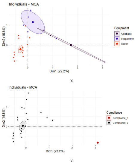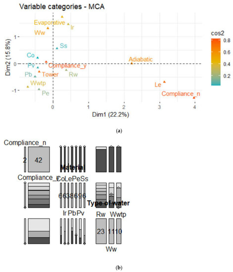 The MCA showed that legislative compliance was most correlated with dimension 1 and the type of water with dimension 2. The variable categories of MCA displayed those with a similar profile grouped together. Second, negatively correlated variable categories were positioned on opposite sides of the plot origin (opposing quadrants). Furthermore, category points that were away from the origin were well represented on the factor map (Compliance_n, Le, Adiabatic, Evaporative, Ir, Ww). The cos2 of variables to dimensions 1–2 determined that variable categories, except Co, Ss, Pv, Pb, Pe and Rw, were > 0.4 by the first two dimensions. Compliance_n was primarily related to Le, Adiabatic and Rw and Compliance_y to Co, Pv, Tower and Wwtp.