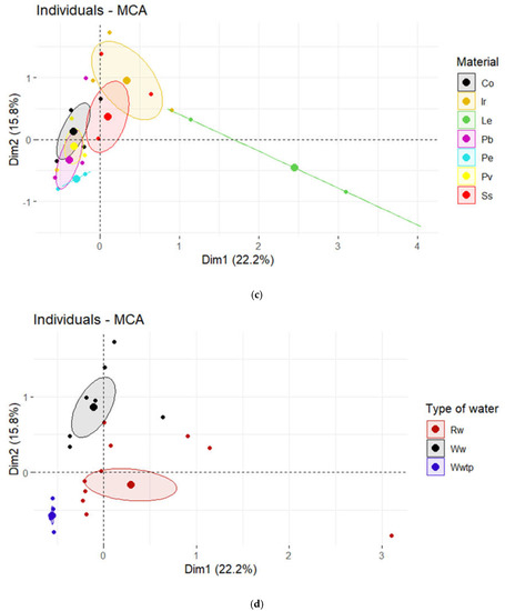 Figure 3 shows graphs of cases for “equipment, legislative compliance, pipe material and type of water”. In each representation, groups of cases were identified according to the different categories of each variable. It is possible to clearly recognize the confidence ellipse clustering cases of each category of a single variable.