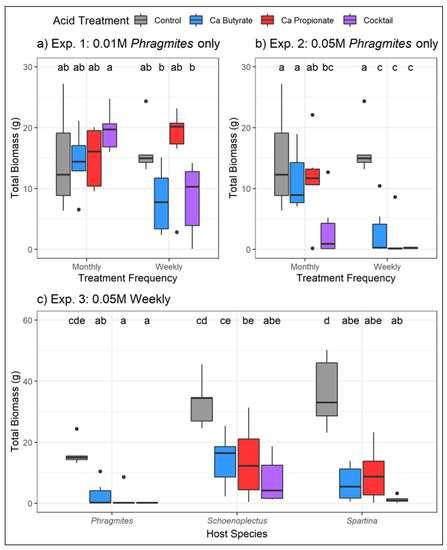 Total plant biomass response to SCFA treatments in (a) low-concentration Phragmites mesocosms, (b) high-concentration Phragmites mesocosms, and (c) high-concentration mesocosms of Phragmites or native species. Colors indicate SCFA type. Letters indicate significant differences among all treatments within an experiment following ANOVA with post hoc Tukey HSD adjustment.