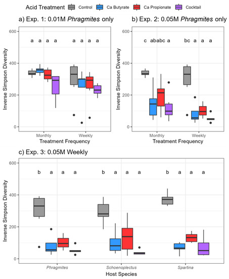 Inverse Simpson diversity of soil bacteria following SCFA treatments in (a) low-concentration Phragmites mesocosms, (b) high-concentration Phragmites mesocosms, and (c) high-concentration mesocosms of Phragmites or native species. Colors indicate SCFA type. Letters indicate significant differences among all treatments within an experiment following ANOVA with post hoc Tukey HSD adjustment.