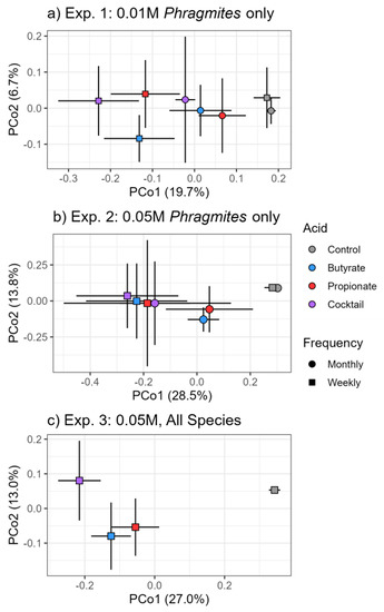 Ordination plots of principle coordinate analysis (PCoA) indicating bacterial community differences among SCFA type and frequency in (a) low-concentration Phragmites mesocosms, (b) high-concentration Phragmites mesocosms, and (c) high-concentration mesocosms of Phragmites or native species. Colors indicate SCFA type. Points represent centroids of all mesocosms within each treatment type. Bars represent 95% confidence intervals around centroids.