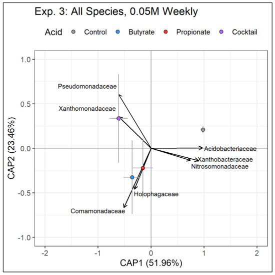 After application of SCFAs, several bacterial families increased and some decreased. For instance, in the positive direction of CAP1, which explained 51.96% of the variation in the model, relative abundance of Acidobacteriaceae and Xanthobacteraceae significantly increased while Pseudomonadaceae, Xanthomonadaceae, and Comomonadaceae decreased. These changes in relative abundance represent a depletion of Acidobacteriaceae and Xanthobacteraceae and an enrichment of Pseudomonadaceae, Xanthomonadaceae, and Comomonadaceae in the soils of pots receiving the SCFA treatments (Figure 5). The taxa in Figure 5 represent those present at the end of the experiment. Soil samples collected midway through the experiment suggest that the same trends were emerging, where high-concentration SCFA treatments were enriched in Pseudomonadaceae and were depleted in members of Acidobacteriaceae compared to controls (Figures S5–S7).