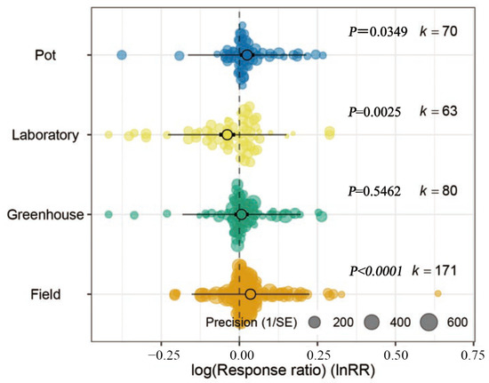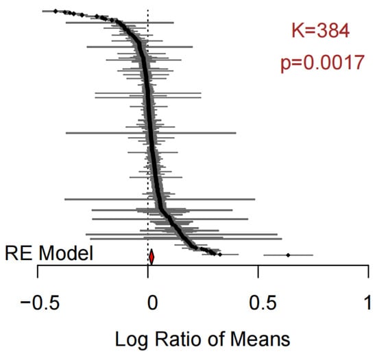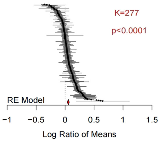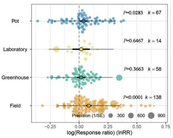 The method for calculating the effect size and variance was taken from the literature [67]. The natural log-transformed response ratio (LRR) was used to measure the effect size and was calculated from the mean treatment value Xt and the mean value in the control Xc as follows: