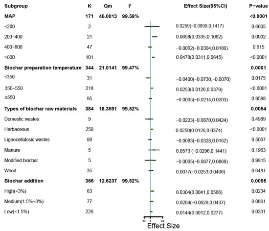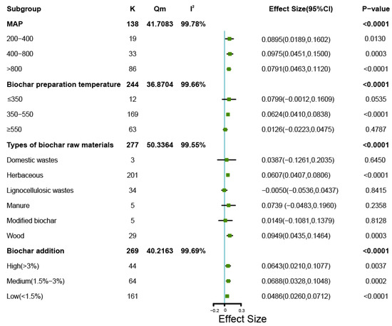 We grouped the various explanatory variables as follows. The experiments were grouped into field, greenhouse, pot, and laboratory experiments. Data from field studies were grouped for MAP with arid (<200 mm), semi-arid (200–400 mm MAP), semi-humid (400–800 mm) and humid conditions (≥800 mm). After standardizing the units of biochar addition (with 27 t·hm−2 = 1% and 81 t·hm−2 = 3%) [65], the biochar addition was grouped into three levels of low (<1.5%), medium (1.5–3%), and high (>3%) application rates. The biochar feedstocks were grouped based on their source type as previously described [66], with manure, wood, herbaceous materials and lignocellulosic wastes, to which we added the group of domestic waste (biochar made from laboratory wastewater sludge, municipal sludge, household waste or discarded mushroom substrate) and modified biochar (iron-based, calcium-based, or manganese-based modified biochar). The pyrolytic temperatures used for biochar preparation were grouped as low (≤350 °C), medium (350–500 °C) and high (≥500 °C).